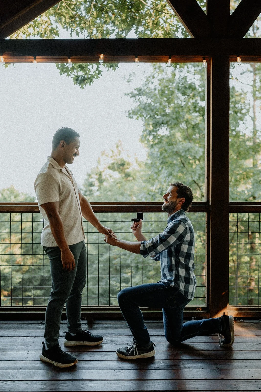 That afternoon, in true stealthy mode, I snuck onto the back deck of Airbnb, where Luke planned to propose at an agreed upon time. There were windows everywhere so I had to army crawl my way from the front of the house to the back deck (okay, I am exaggerating but it’s a funny image, right?). Once I was set up and ready, I continued to hide until I heard Luke and Justin come outside and once they were facing each other, I knew that was my cue! I immediately started taking photos, trying to be as discreet as possible (although, this is tricky when a random person pops up on your private back deck). After Justin said “yes” and they spent a few moments soaking it in, I finally came over to congratulate them and celebrate. When we walked back inside the house, their friends had quickly set up a mini engagement party for them and had champagne ready to toast the newly engaged couple. It was a beautiful sight to behold, truly.